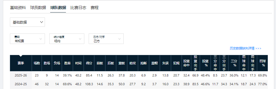 新疆男篮第一阶段令人失望的原因,整体上看与辽篮有相似之处。首先是成绩,第一阶段过后,新疆男篮以39.1%的胜率,排在积分榜第15位。